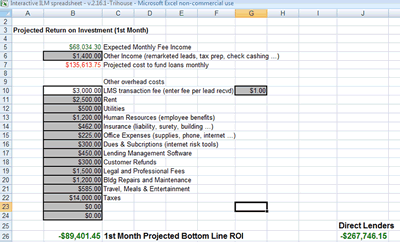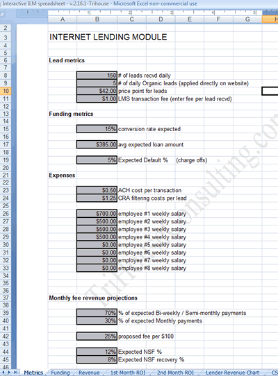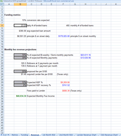 Every entrant to the payday loan industry needs our new "PDL Excel Spreadsheet Pro Forma." We had our analytics gurus build this tool. With it, you have the ability to "play" with multiple inputs including lead costs, default rates, loan conversion rates, number of loans funded daily/monthly, average loan principal amount, fee charge per loan principal, rollovers, employee costs, overhead expenses...